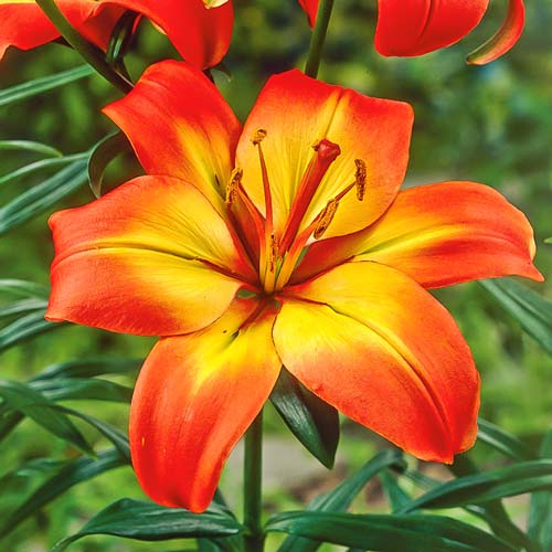 Азиатская лилия Линда гармонично впишется в любой ландшафтный дизайн. Куст вырастает крепким и плотным, высотой до 60 см. На стебле образуются крупные двухцветные цветки – ярко-красные с насыщенно-желтой серединкой. Все лепестки украшены редким темным крапом. В полном роспуске диаметр цветка равен около 14 см. Период цветения начинается в июне или июле. Лилия источает приятный сладковатый аромат и долгое время сохраняет свежесть в срезке. Она идеально подходит для составления букетов.