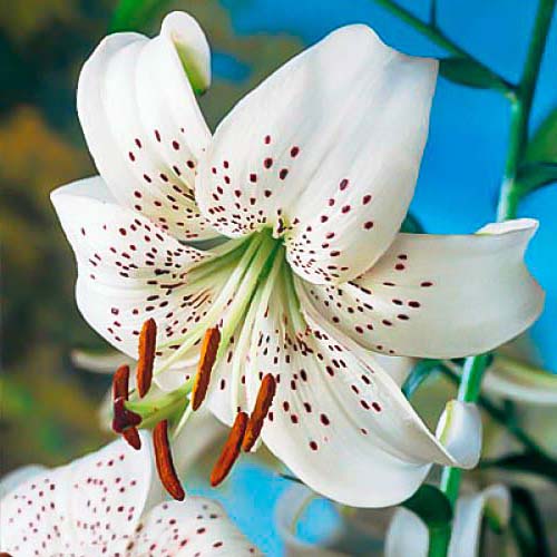 Это эффектный луковичный многолетник с побегами, длиной 1,2 м. На каждом цветоносе формируется множество цветков (около 20 штук) поникающей, чалмовидной формы. В полностью раскрывшемся виде их диаметр равен 12 см. Лепестки окрашены в белоснежный цвет, с ярким вишневым крапом. Цветение начинается в июле и заканчивается в августе. Максимальное развитие лилии наблюдается на 2 – 3 год с момента посадки.