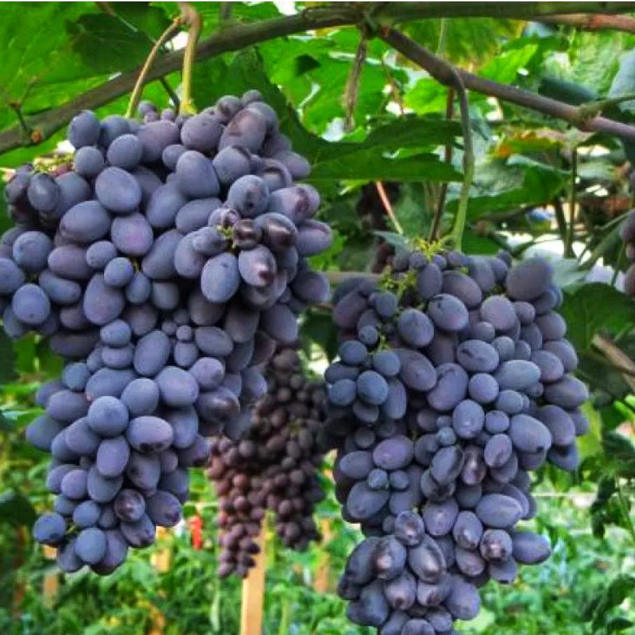 Грозди крупные, средней плотности, шириной 18 − 20 см и длиной около 25 см. Вес их равен 600 – 900 г. Иногда встречаются экземпляры массой 2 кг. Форма ширококоническая. Гребненожки прочные и длинные. Ягоды овальные, весом 10 – 12 г. Кожица окрашена в темно-синий цвет с сизым налетом. Мякоть мясистая и сочная, с приятным кисло-сладким вкусом. В каждом плоде есть 2 – 3 косточки.